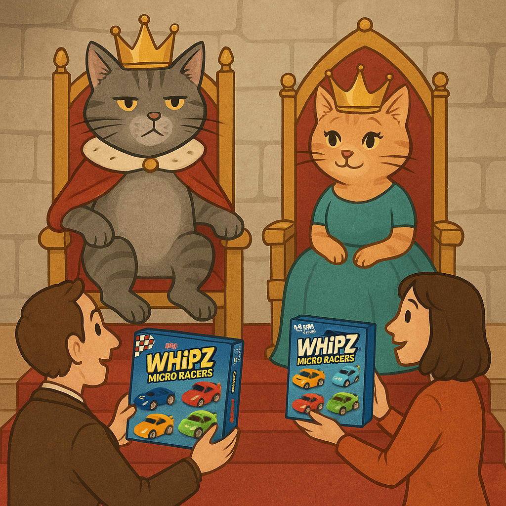 /showme Cat King on throne next to Cat Queen on her throne. Humans are presenting them with USA Toyz Whipz Micro Racers as gifts.