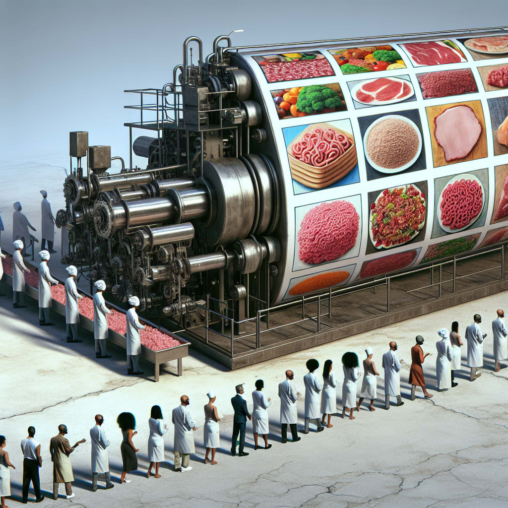 /showme a large machine with human artists going in one end and ground meat canvas paintings coming out the other