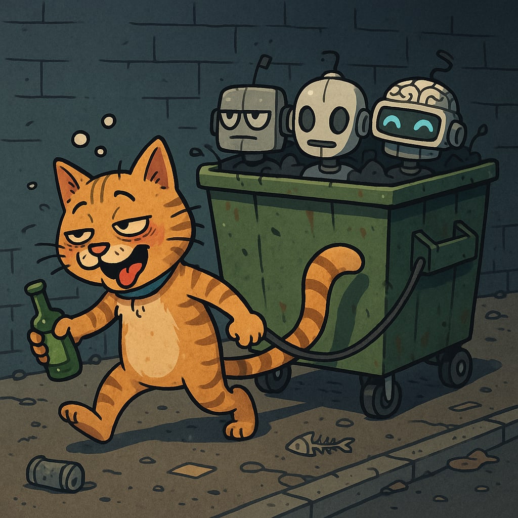 /showme a drunk cat dragging a dumpster full of artificially intelligent garbage