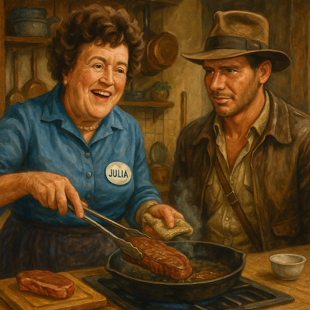 Disclaimer: The casting of Meryl Streep to play Juila Child as portrayed by an AI was in no way trained on, based on, or derived from stolen, unlicensed, unauthorized, uncompensated, or copyrighted images or video of the likenesses of either actress, their representation, or their estates without their consent or knowledge.