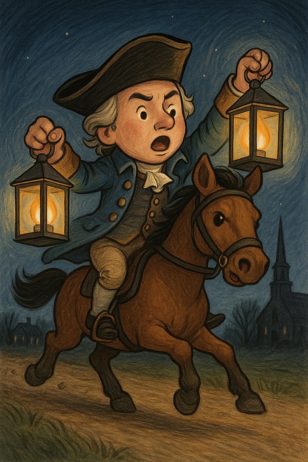 /showme a mini Paul Revere riding to warn the colonists with his mini lanterns