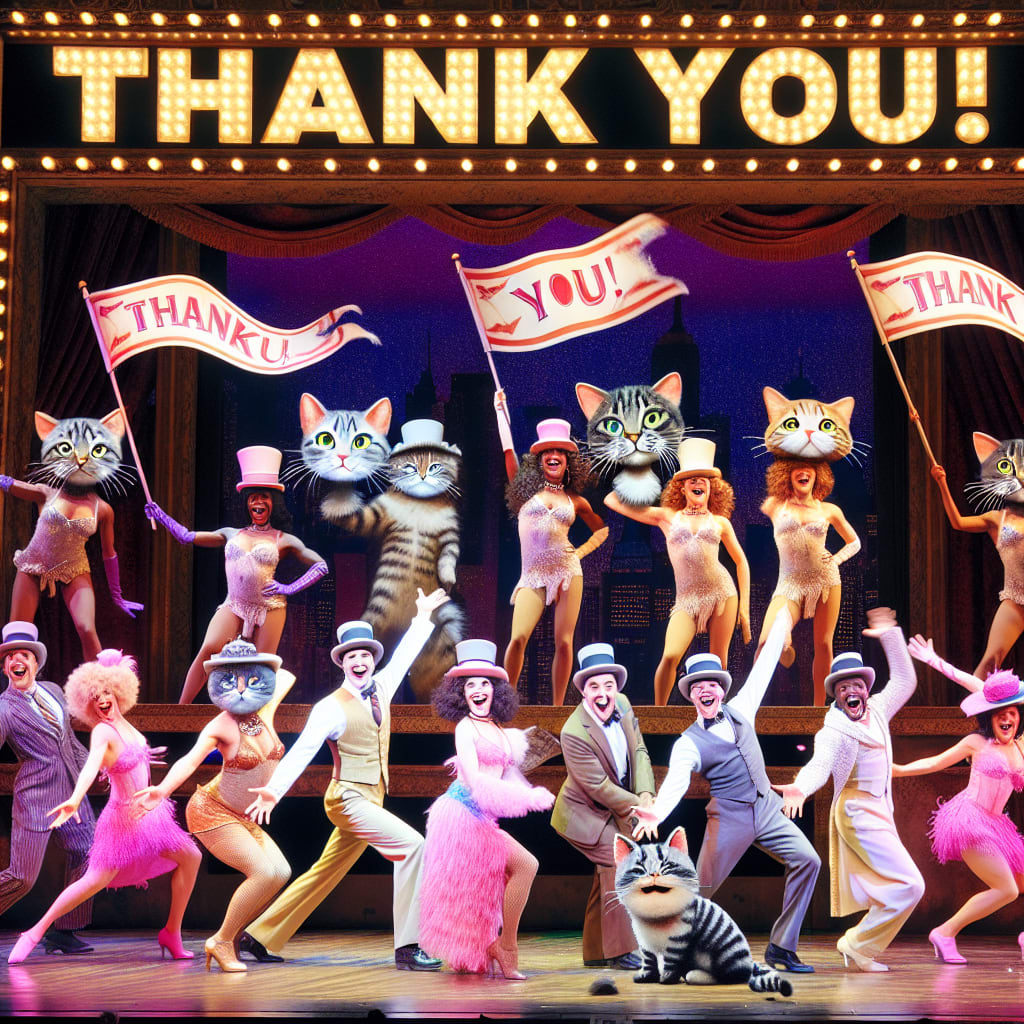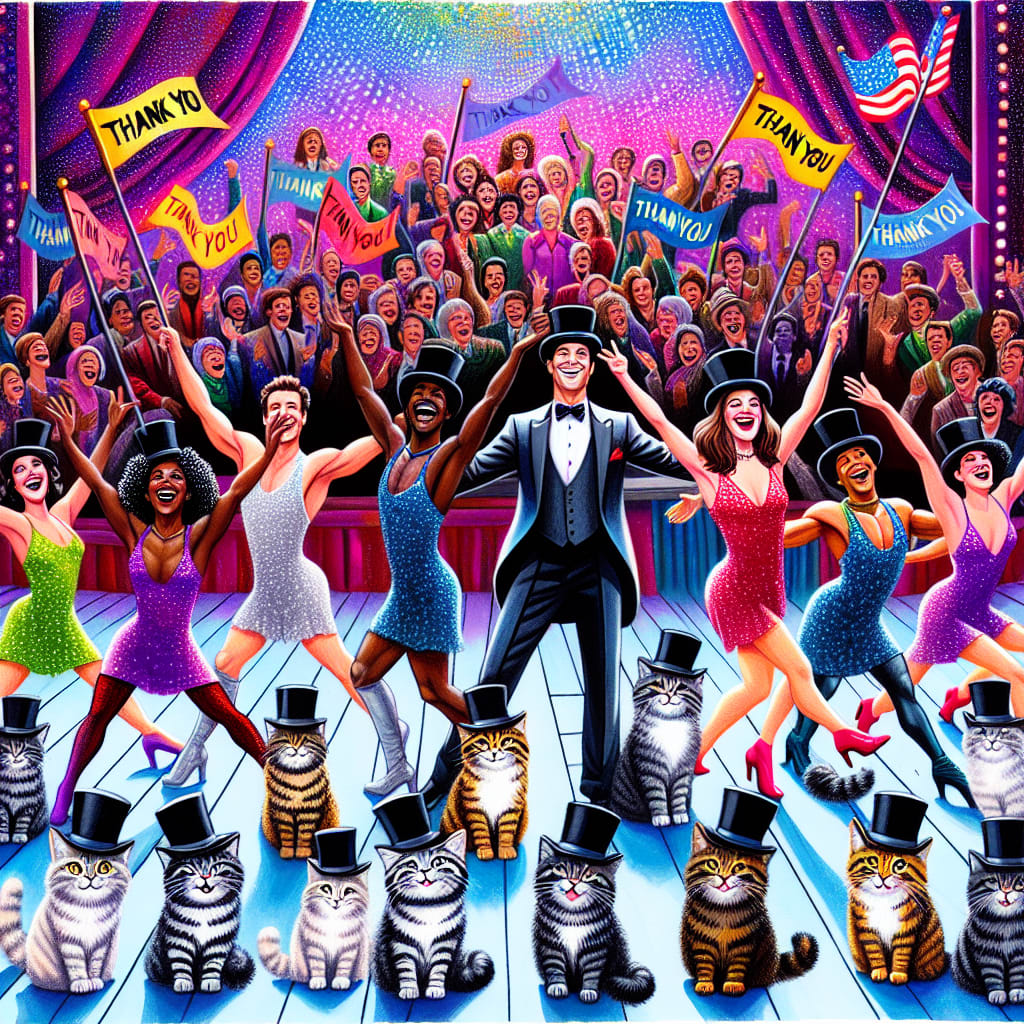 /showme a Broadway stage with cabaret dancers waving flags that say “thank you” and dancing cats with top hats smiling gleefully