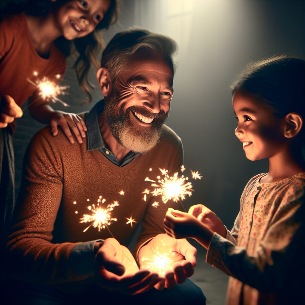 /showme a happy dad receiving 4 lights from a mysterious daughter with a look of relief on her face.