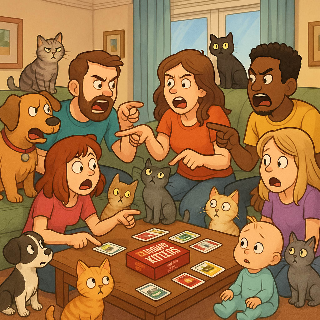 /showme a large group of cats, dogs, and humans in a living room playing Exploding Kittens and arguing while kittens, puppies, and babies look confused at what everyone is doing