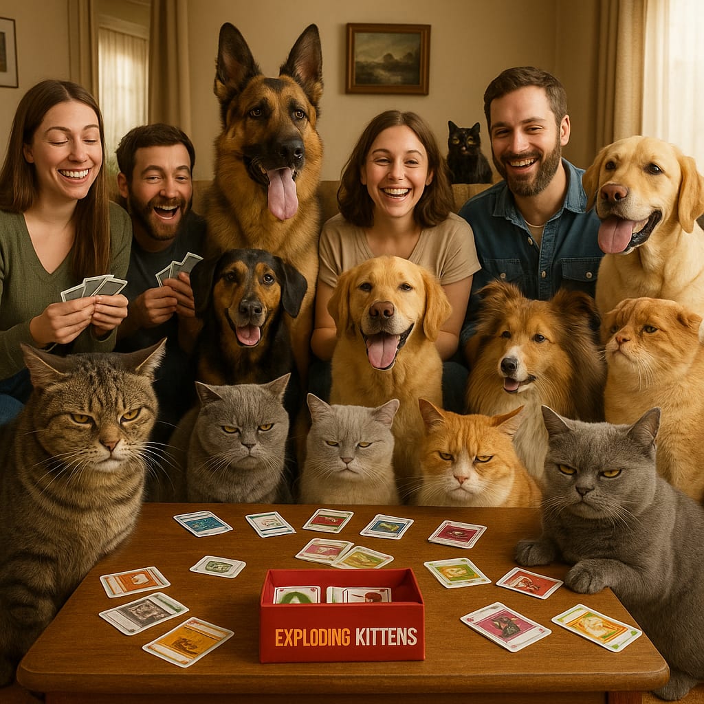 /showme a large group of photorealistic cats, dogs, and humans in a living room playing Exploding Kittens with the cats looking exasperated at losing to the dogs, the humans pleased to be playing with their pets, and the dogs drooling over what to eat afterwards