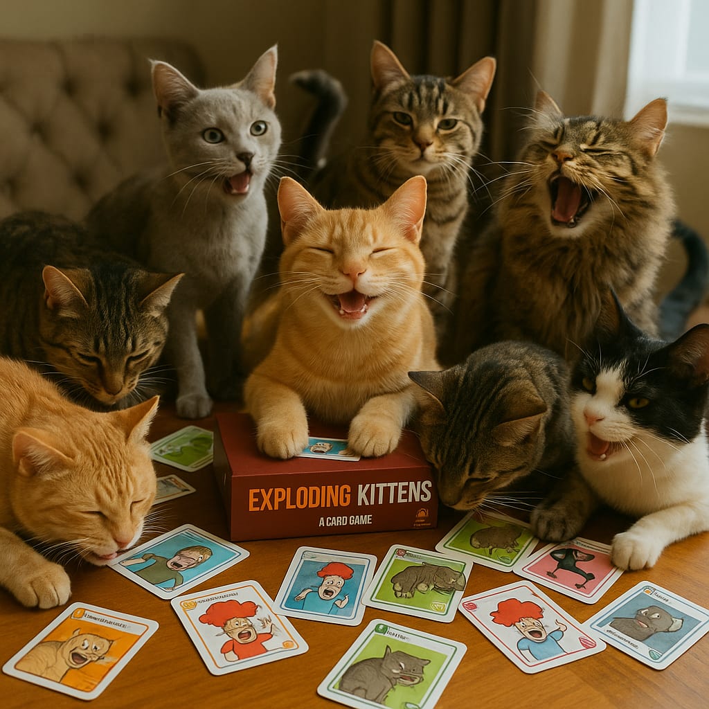/showme many real cats playing card game called “exploding humans” and having a great time.
