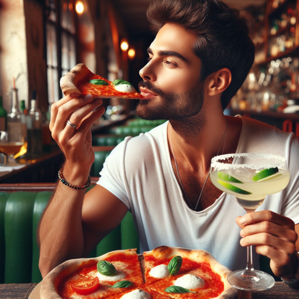 /showme an Italian guy eating a margherita pizza and drinking a margarita