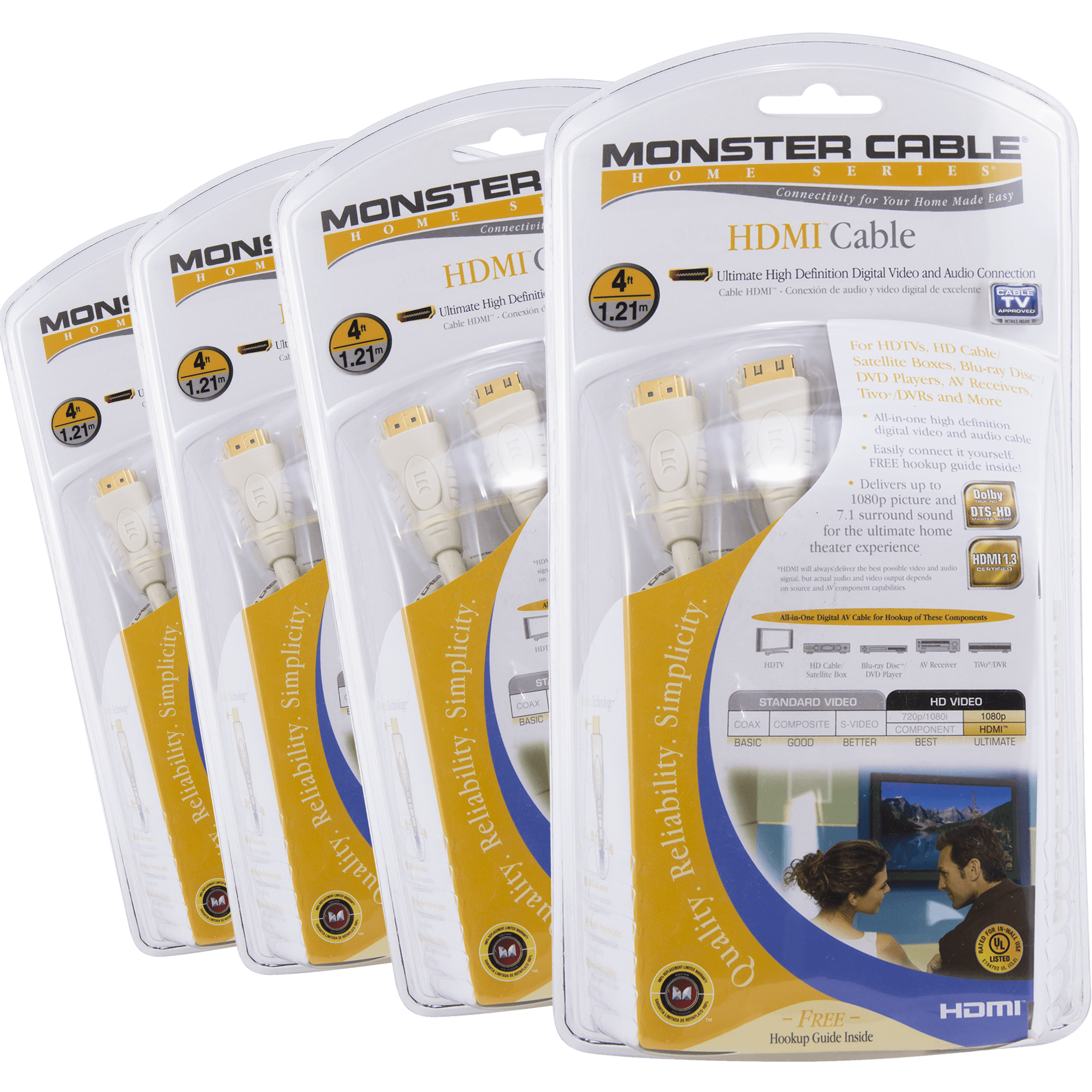 Specs====- Model: 120237MC- Type: High Speed (10.2gbps) - Box says “delivers up to 1080p” but is compatible with 4K and 3D TVs- Length: 4ft- Rated for in-wall use- 24k gold contactsCondition: New Warranty: 1 Year Monster Estimated Delivery: 1/12 - 1/14Shipping: $5 or free with VMP What’s in the Box?====4x 4ft HDMI cablesPictures ====Retail packagingHDMI plugsTime to organize!Price Comparison====$27.80 at Amazon (2 reviews, fulfilled by Amazon)Find a relevant price comparison? Please share it in a comment in this thread