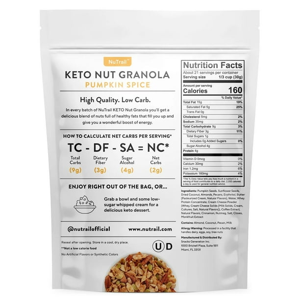 This would be great if it wasn’t sweetened. And pumpkin spice, urk. Just plain seeds and coconut would we yummy, and useful as a topper for yogurt, cereal, fruit salad, etc. But with those flavors included, no way.