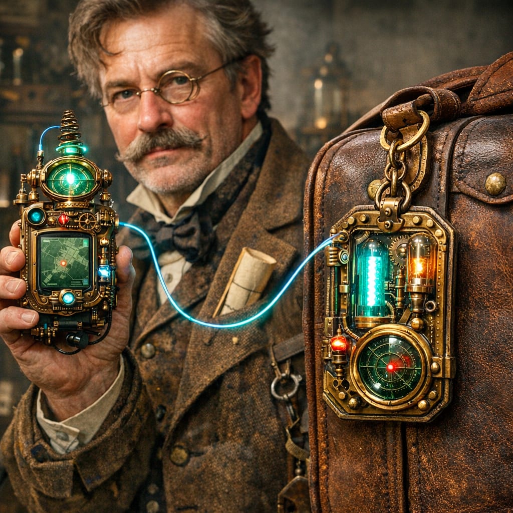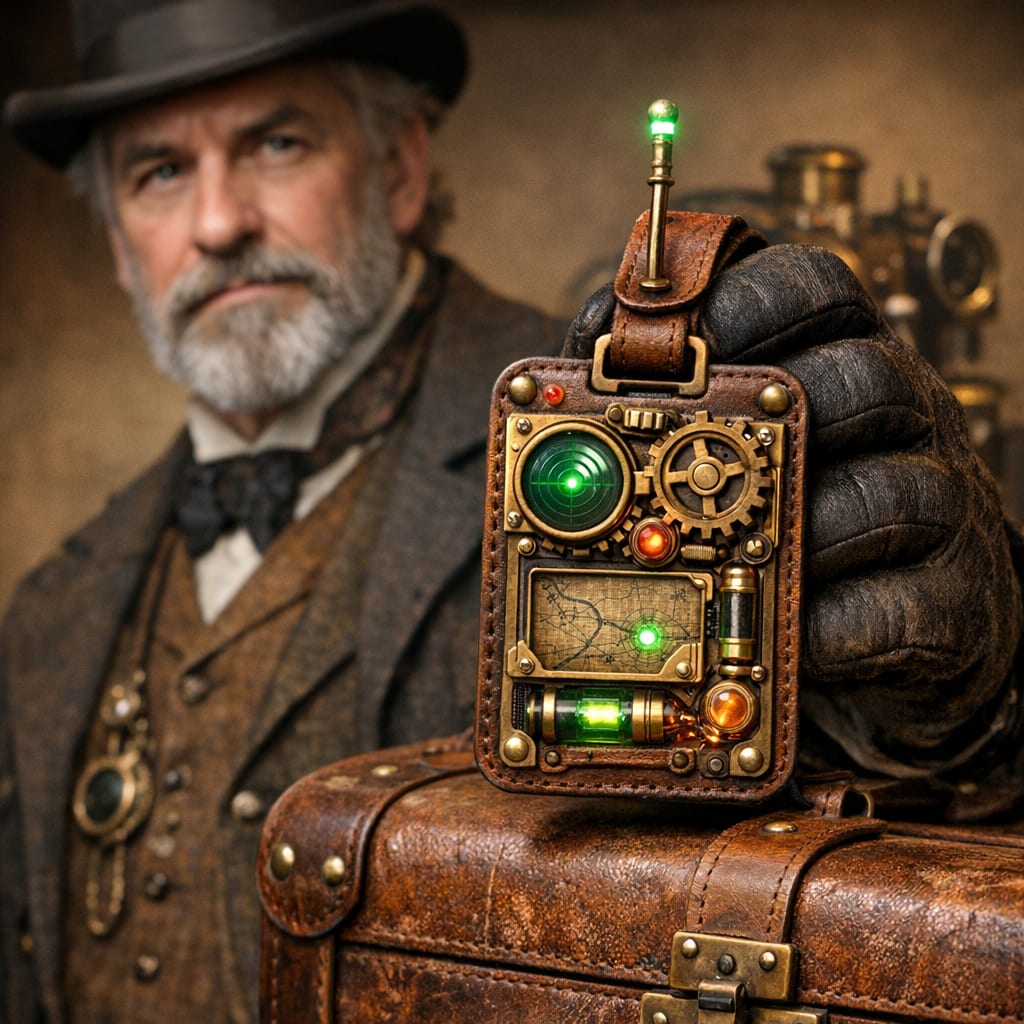@cfg83 Here’s the image you requested for “1800s scientist with IMPLAUSIBLE high tech brass glass and gears luggage tag and tracker”