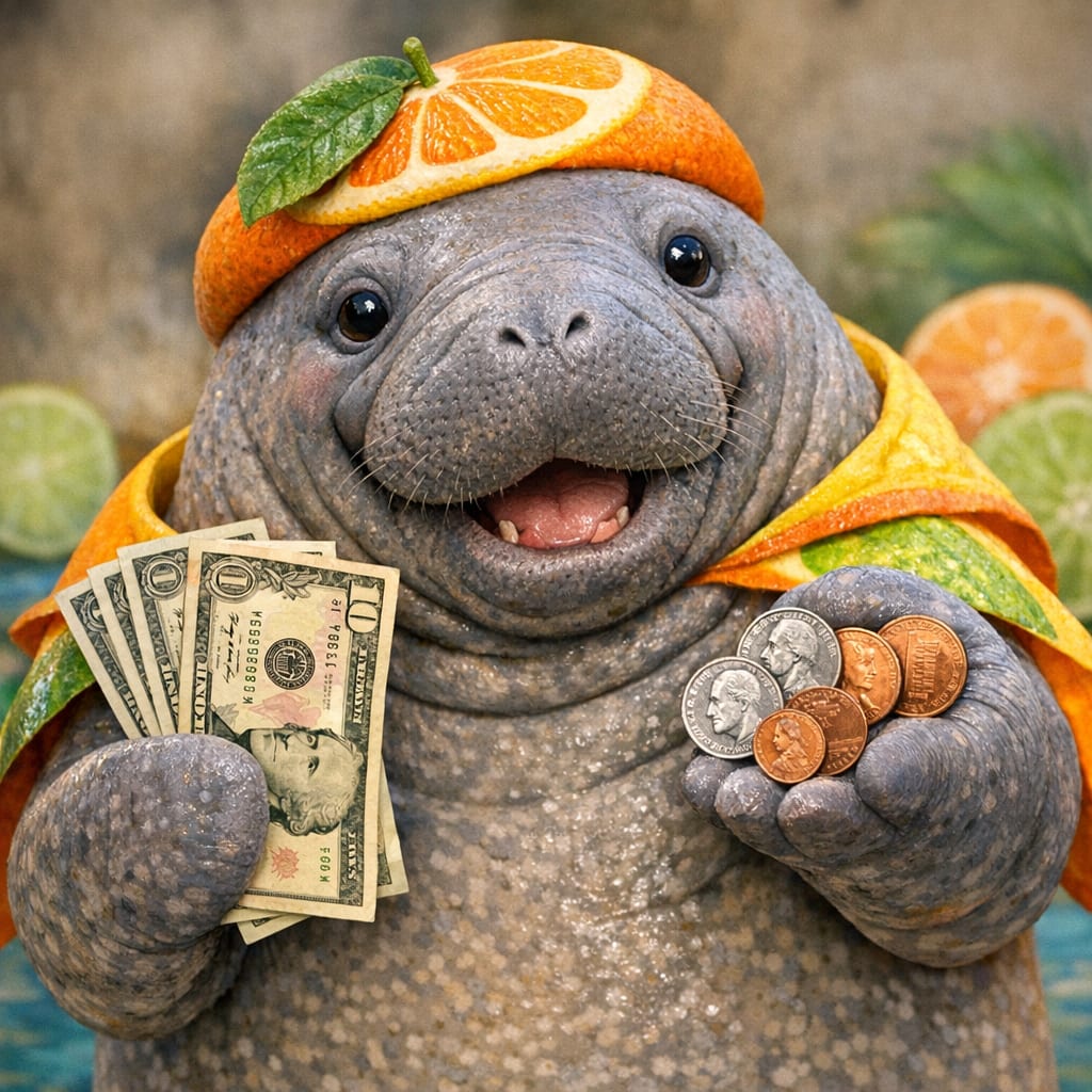 @cfg83 Here’s the image you requested for “stupendous tangy manatee holding 13 dollars and 23 cents.”