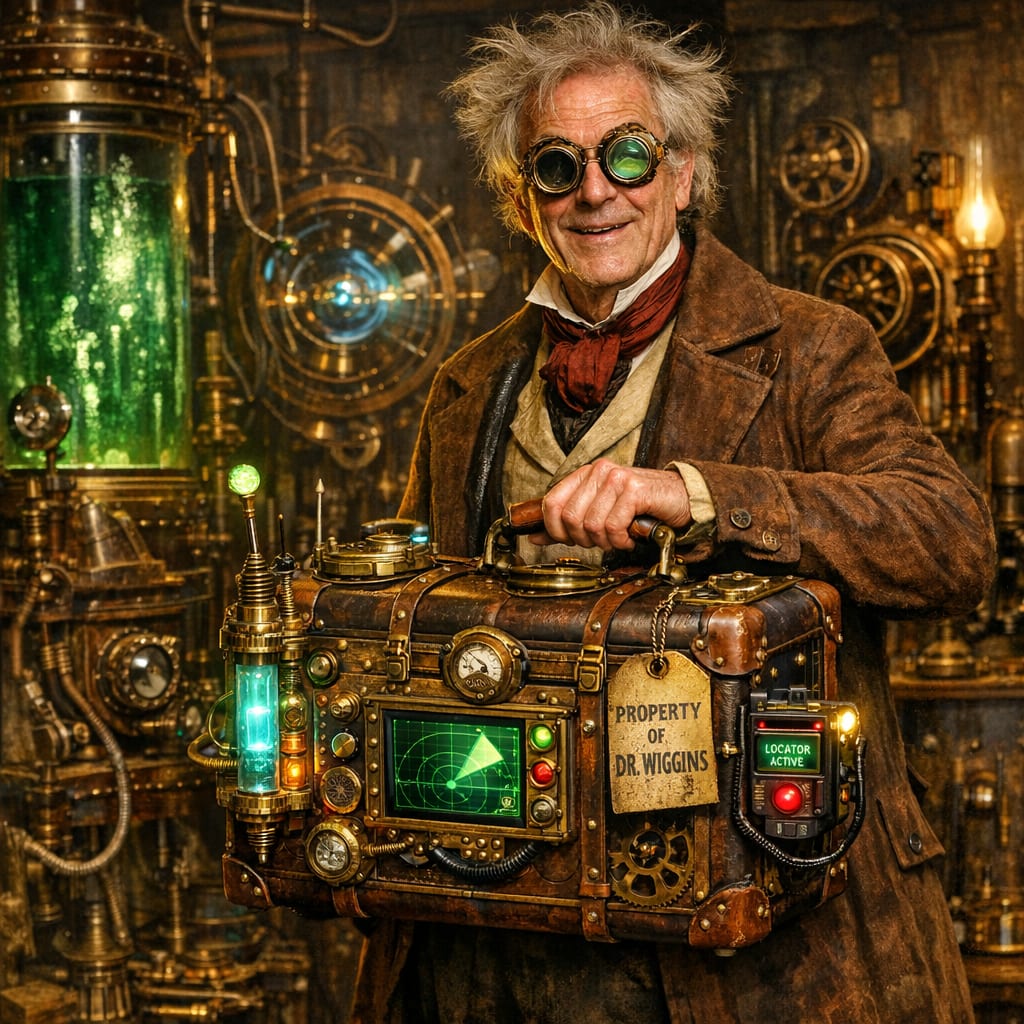 /showme 1800s scientist with IMPLAUSIBLE high tech brass glass and gears luggage tag and tracker