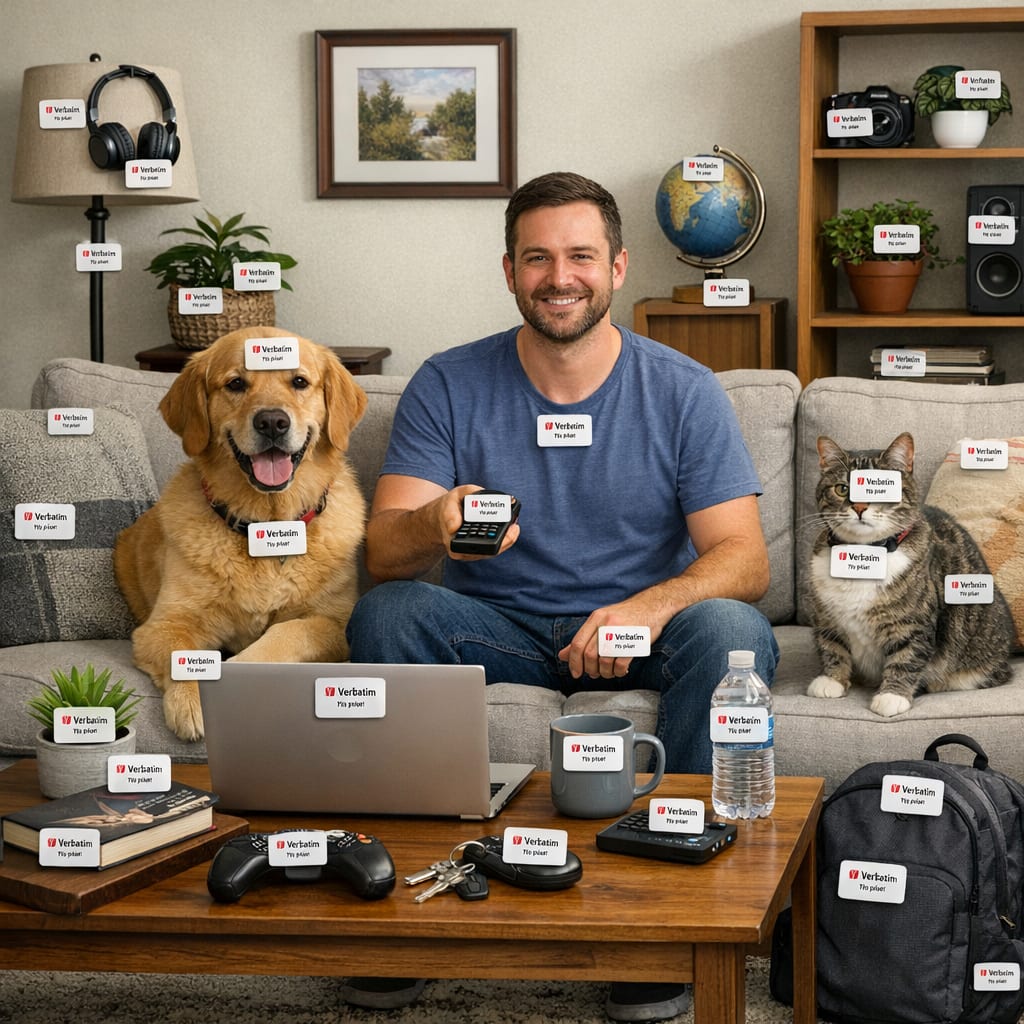 @cfg83 Here’s the image you requested for “Room where every object and pet and human has a Verbatim My Finder Bluetooth Tracker taped to it.”