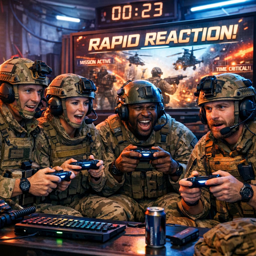 @zippyus Here’s the image you requested for “rapid reaction force squad playing a rapid reaction electronic game”