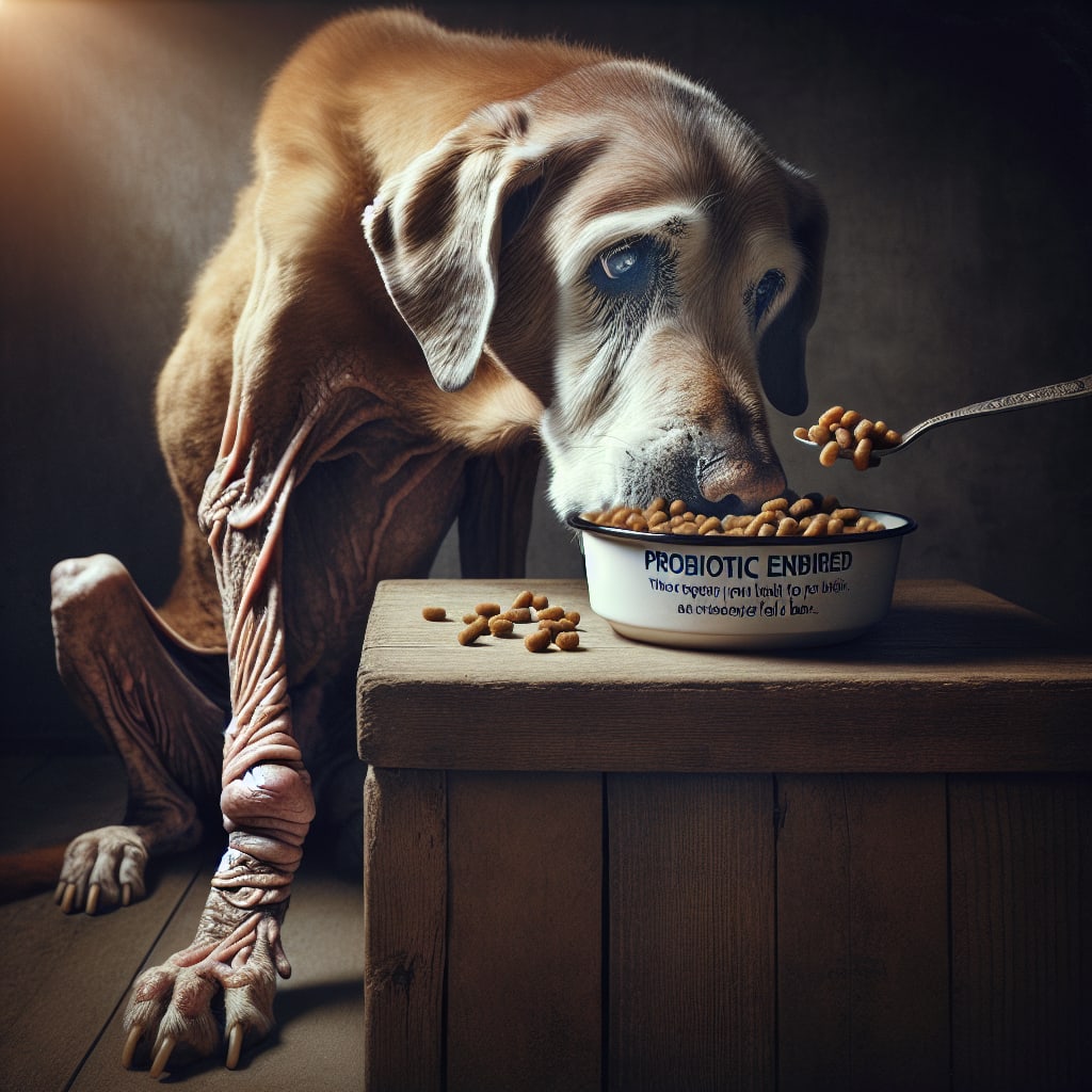 /showme a stressed out dog with bad hips and joints eating probiotic food to feel better.