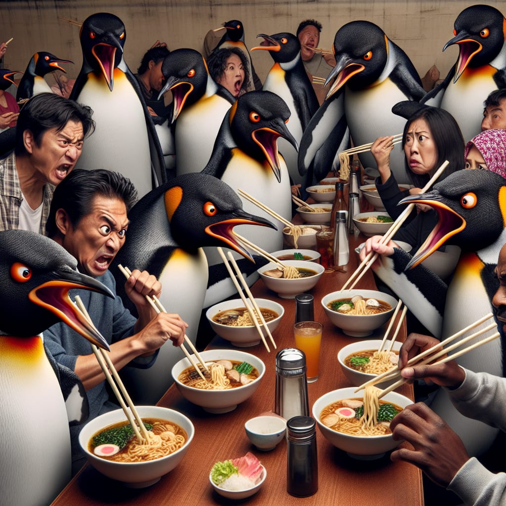 /showme angry penguins eating ramen and attacking people with chopsticks