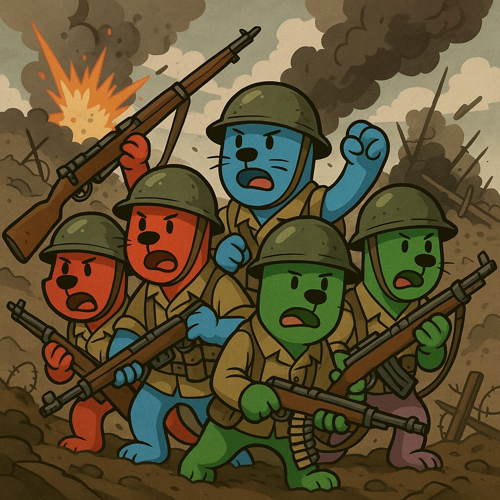 Soldier #2 has a blue body but is red from the neck up. There’s an extra rifle being raised into the air by a disembodied red otter hand. “Otter Pops” are called for, but these are just cartoon otters.