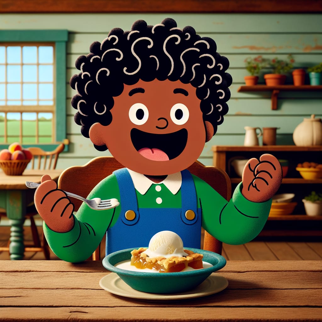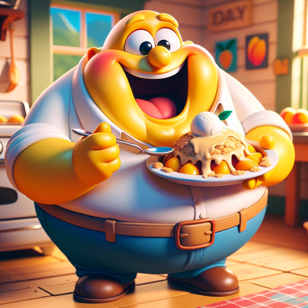 /showme a cartoon character entirely unlike Homer Simpson delightedly eating peach cobbler