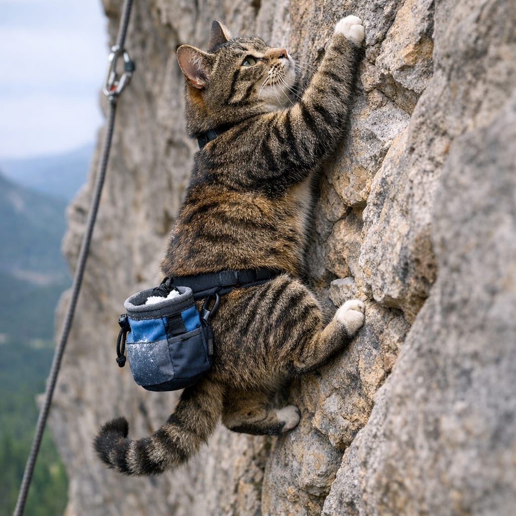 /showme Cat is rock climbing while wearing a chalk bag on his belt.
