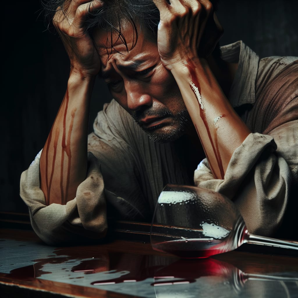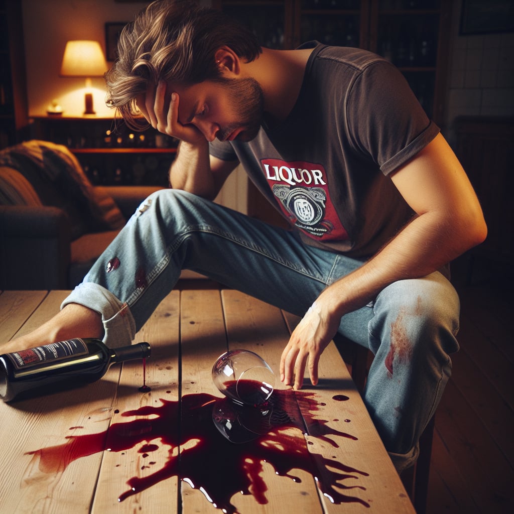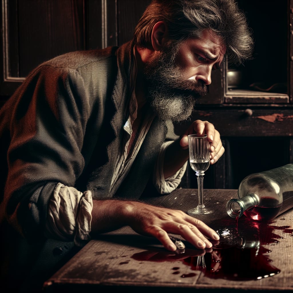 /showme a Russian alcoholic whining over spilled wine while drinking vodka