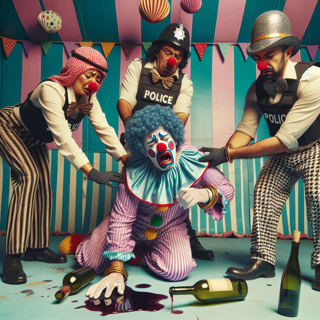 /showme alcoholic clown whining over spilled wine while getting arrested by clown police