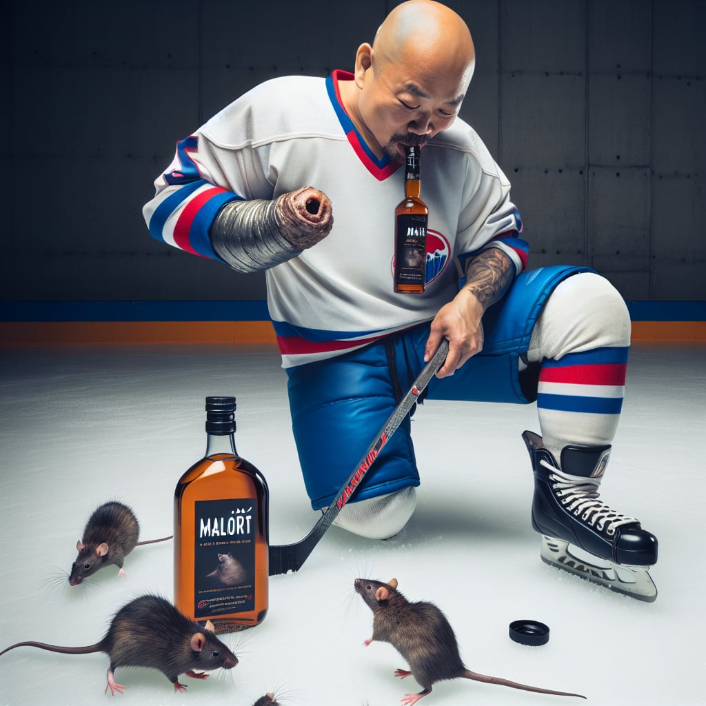 /showme a one-armed hockey player drinking Malört from the bottle while being chased by rats