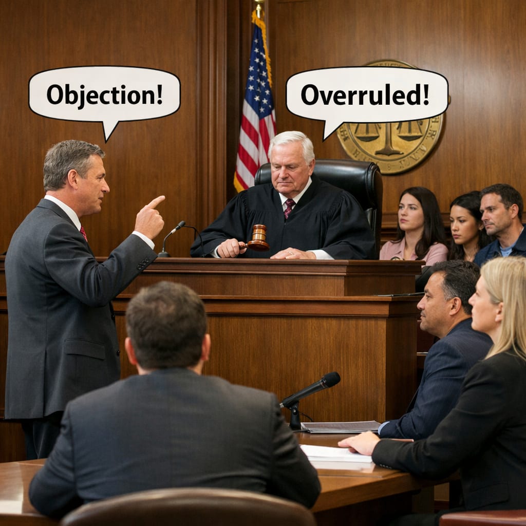 /showme (& [lawyers, judge, jury] ) and (& objection = " overruled ")