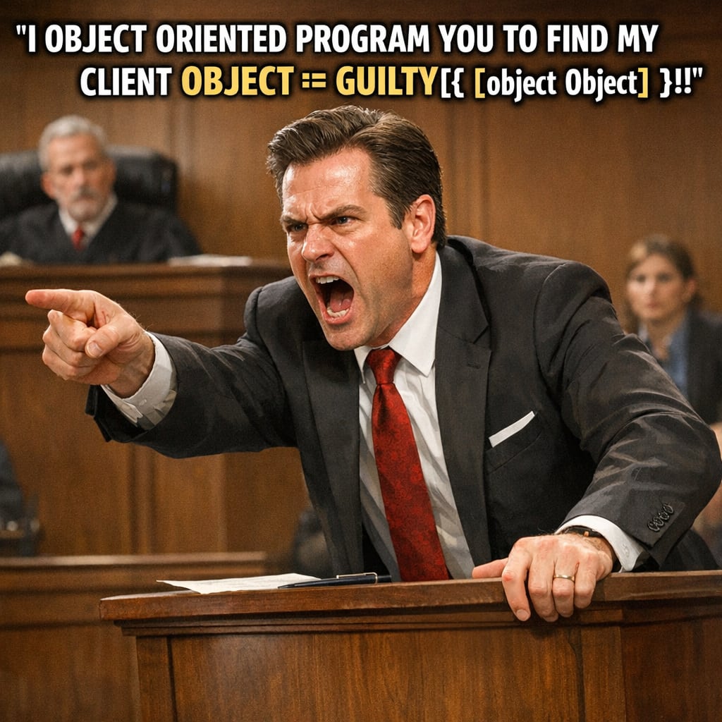 /showme an angry attorney standing to shout “I object oriented program you to find my client object != guilty[{&}]!”