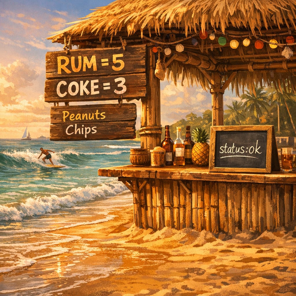 /showme cinematic illustration of a warm beach where sand & surf blend together, and a tiki bar with a sign reading rum=5&coke=3 hangs beside a list of snacks: [peanuts, chips] and a small chalkboard shows the words {“status”:“ok”} in a careful script.