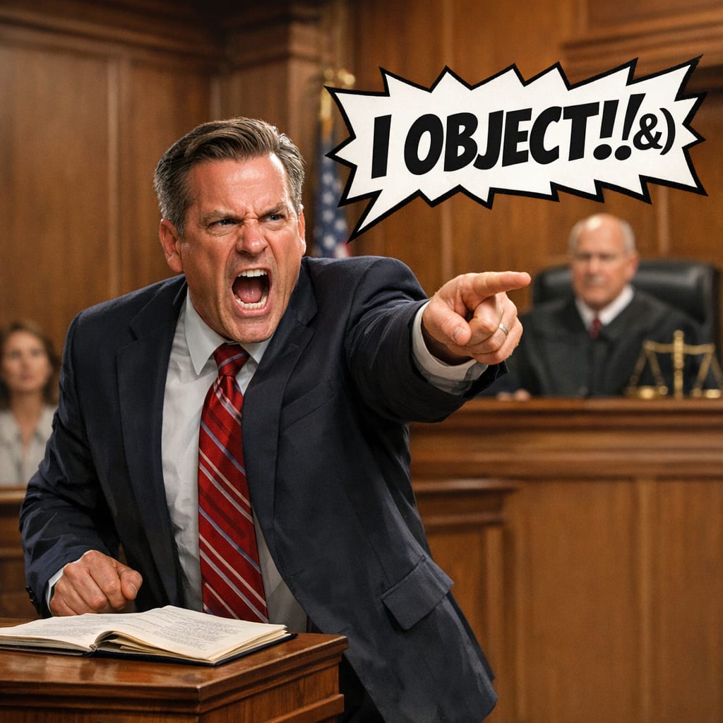 /showme an angry attorney standing to shout “I object[{&}]!”