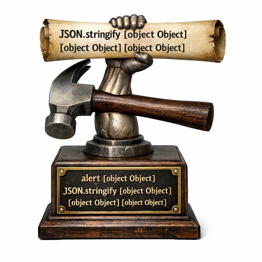/showme a hammer with an arm holding a scroll that says JSON.stringify(&) above a plaque that says alert(JSON.stringify(&))
