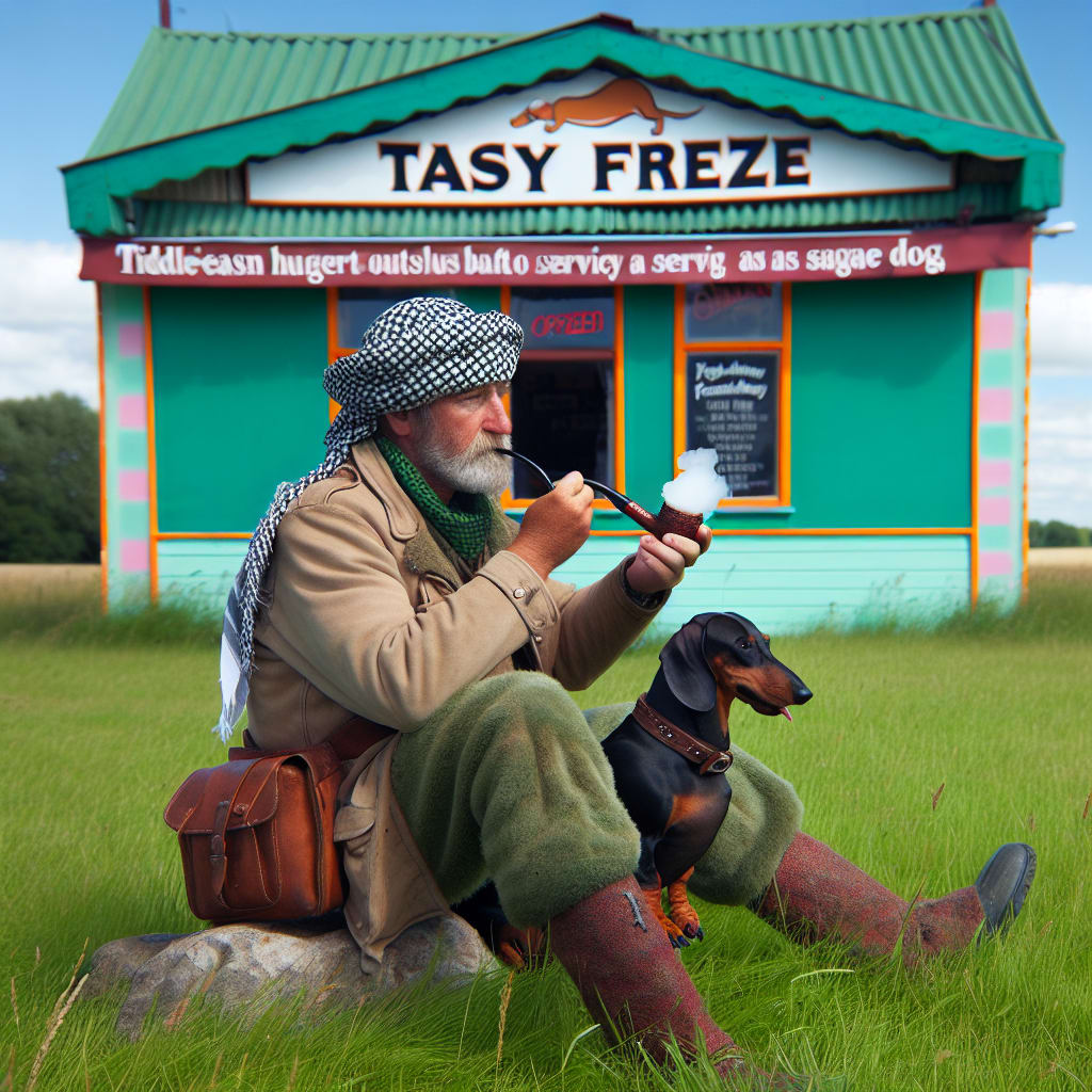 /showme a hunter smoking on a sausage dog outside the tasty freeze