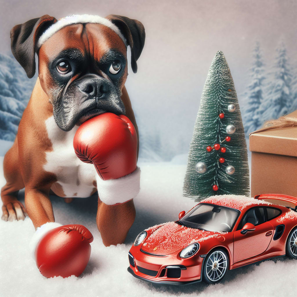 /showme a Boxer dog thinking outside the box while boxing in a Porsche Boxer on boxing day