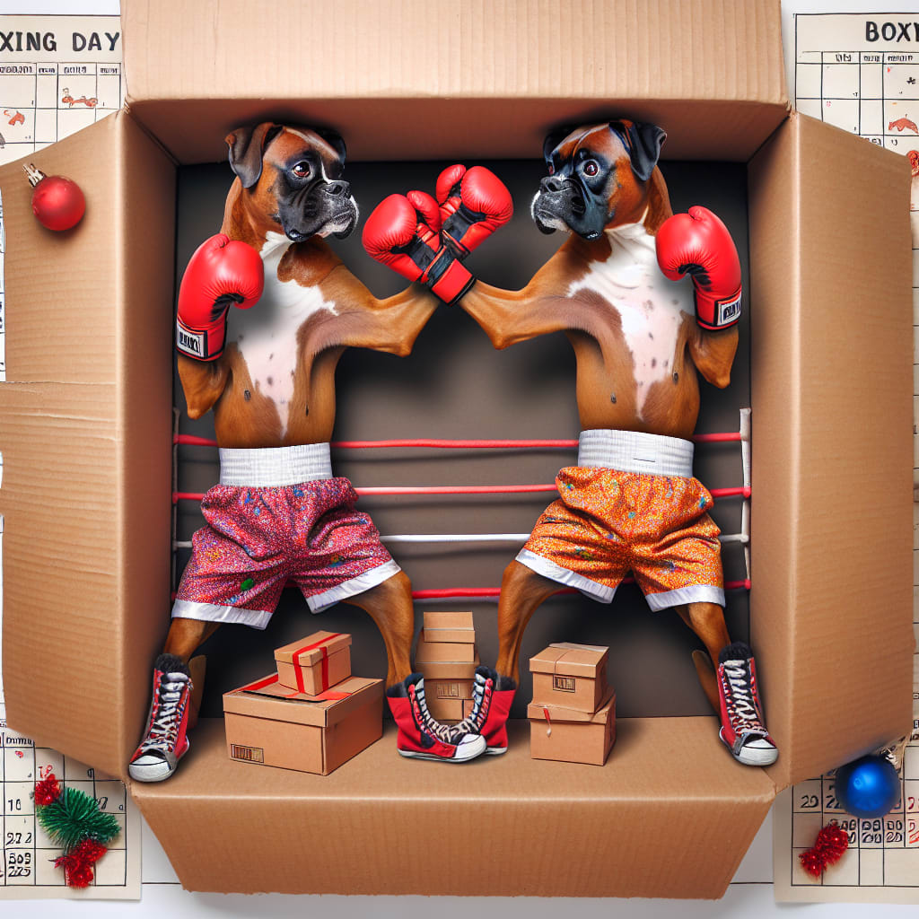 /show me two boxer dogs wearing boxers boxing a box on boxing day in a box