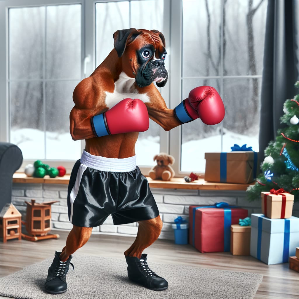 /showme a boxer dog wearing boxers boxing on Boxing Day