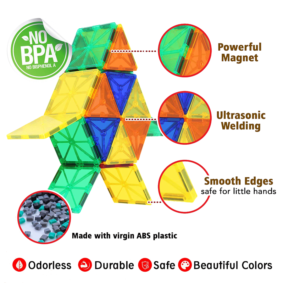 Specs====- Model: TILES60A- Condition: New- Material: ABS plastic - 60 large pieces with 5 different shapes- Compatible with Picasso, Magna-tiles, Neo-puzzle, Mag-genius, Play-mags, Shape-mags, Children-Hub, Magnetic Stick N Stack, V-Canny, Magees, Jack & Roo and others- Dimensions: - Large Squares: 6" x 6" - Small Squares: 3" x 3" - Small Triangles: 3" x 3" - Medium Triangles: 3" x 4" - Tall Triangles: 3" x 5.5"What’s in the Box?====4x Large Squares24x Small Squares18x Small Triangles8x Medium Triangles6x Tall Triangles1x Storage bag1x Instruction book with ideasPrice Comparison====$32.99 Amazon