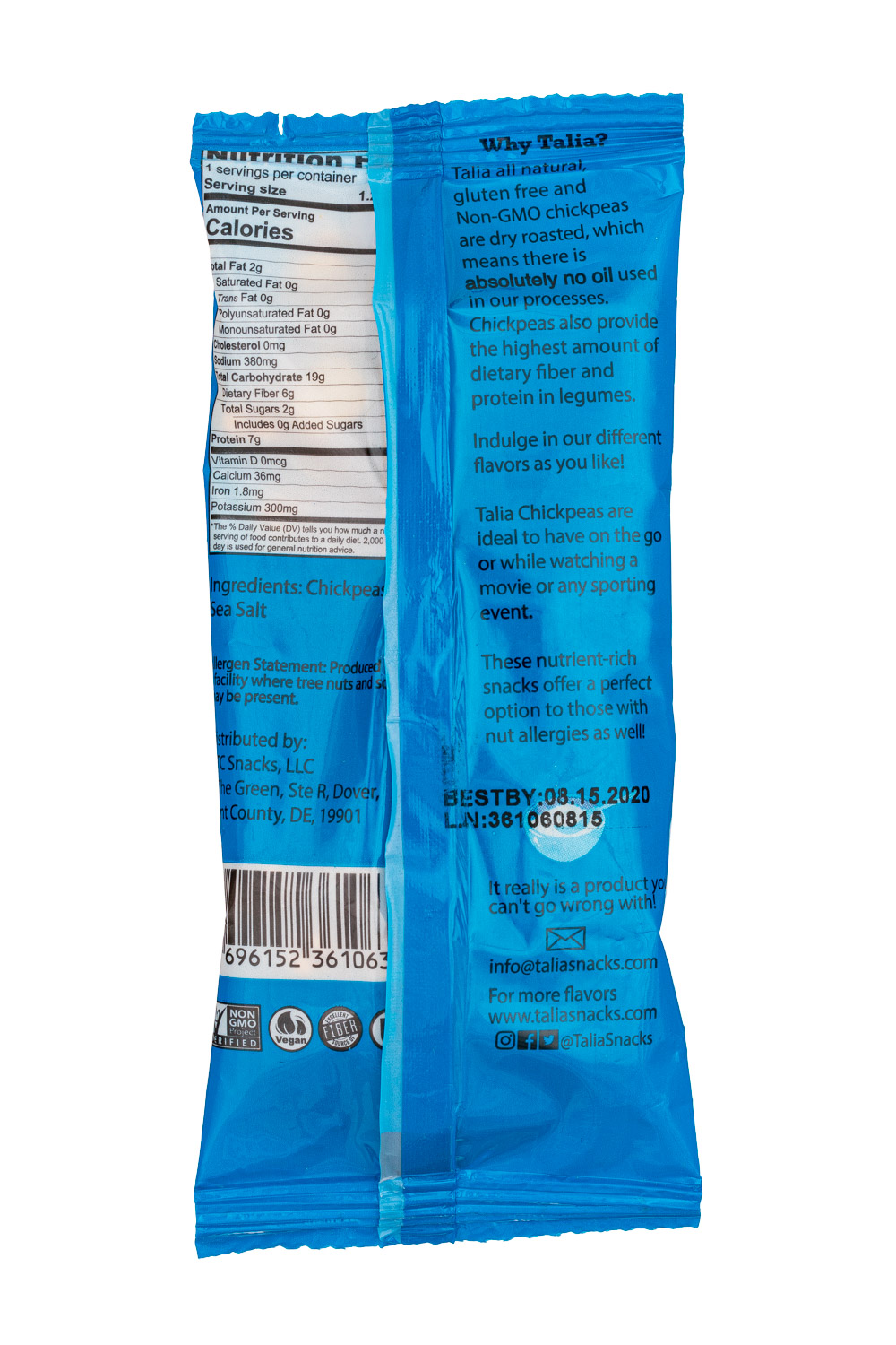 Superfood in unique flavor; High protein and high fiber chickpea snacks are combined with authentic barbeque, hot chili, coconut, sea salt, and olive & oregano savor. Talia’s vegan elevenses are allergy-friendly. Totally gluten-free, peanut free, tree nut free, grain free, and dairy free.