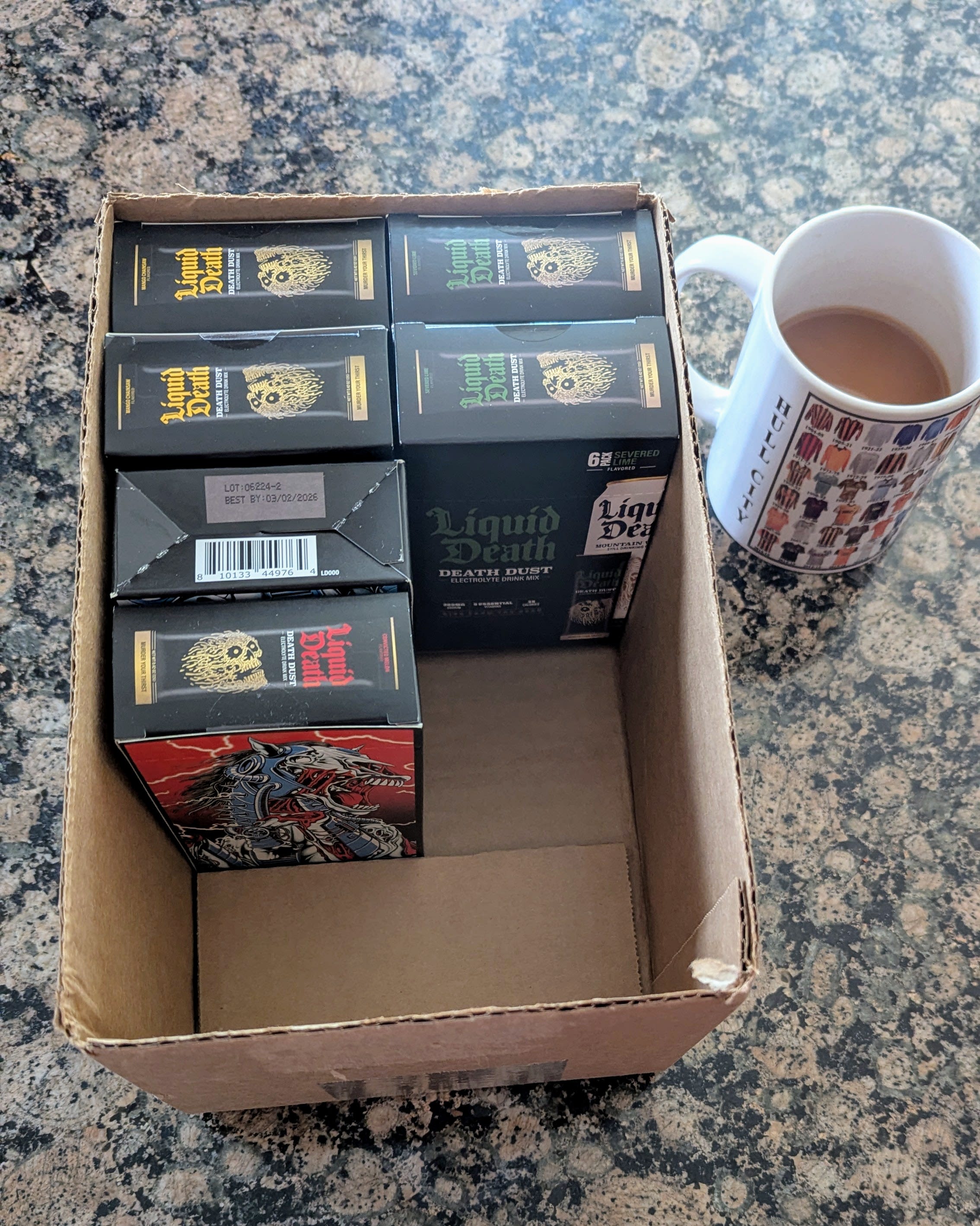 I love Liquid Death products; in fact, I bought one of these variety packs of Death Dust from Amazon a month ago.