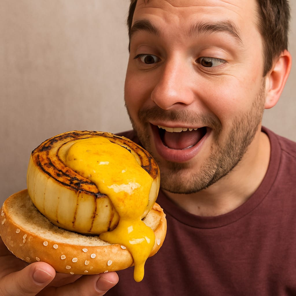 /showme a thick sliced grilled onion on an open bun with hot spicy mustard covering it and dripping over the sides of the onion and a man drooling and eager to start eating it.