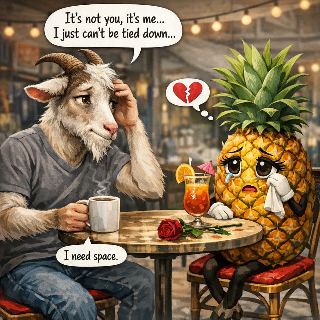 @cfg83 Here’s the image you requested for “Anthropomorphized goat unable to commit to a relationship with a pineapple.”
