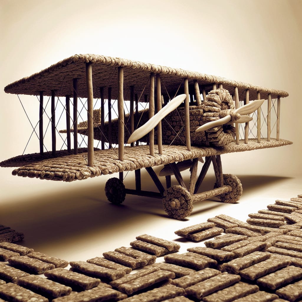 /showme Wright Brothers airplane made out of granola bars, sepia photograph