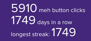I have been here 4…5… or so years and I am always reading about Meh buttons streaks. I rarely miss a day checking in but couldn’t figure out how to be a Meh button clicker. Until today. I guess it’s been in my face everyday but I’m evidently too dense to participate in Mehnanigans.