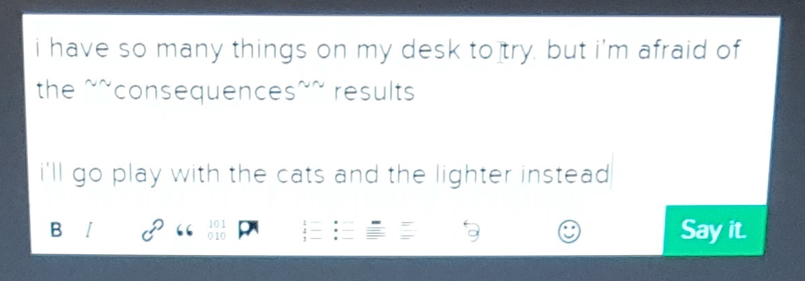 @PlacidPenguin hang on, wait? so i’m all good? or do i have 19 bad things waiting around the butcher block?