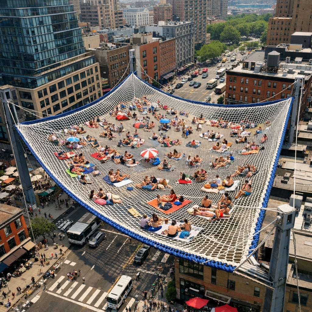 @djslack Here’s the image you requested for “a massive hammock the size of a city block”