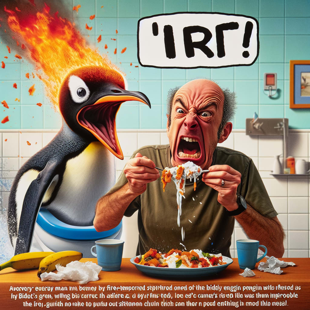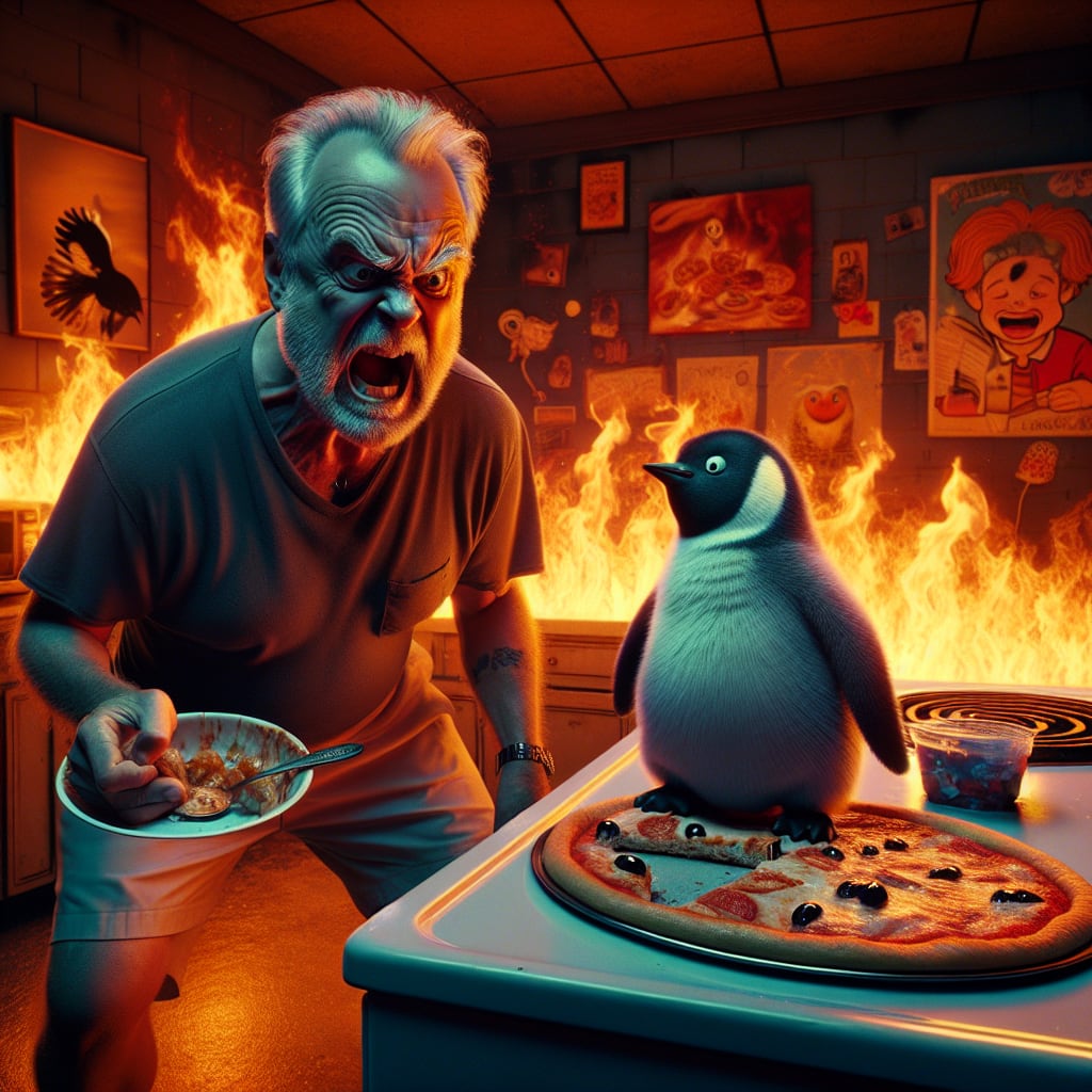 /showme penguin eating pizza with angry man in kitchen with angry expression, pixar renderman, promotion artwork, riot entertainment, iralki nadar, room is on fire, sgi iris graphics, cereal box, infra - red, i’m dad, aardman studios, lol, ember, graffiti, magpie, the background is on fire, realistic photography, jello, billboard