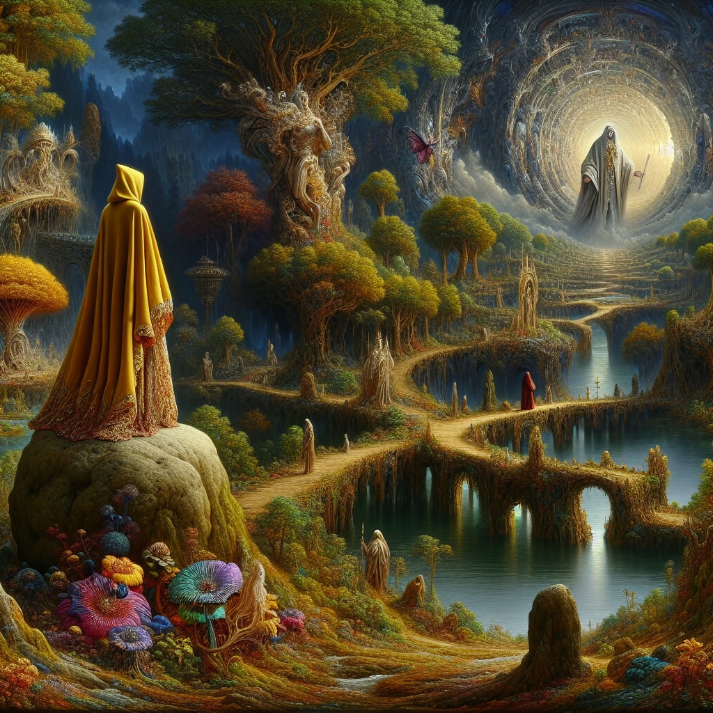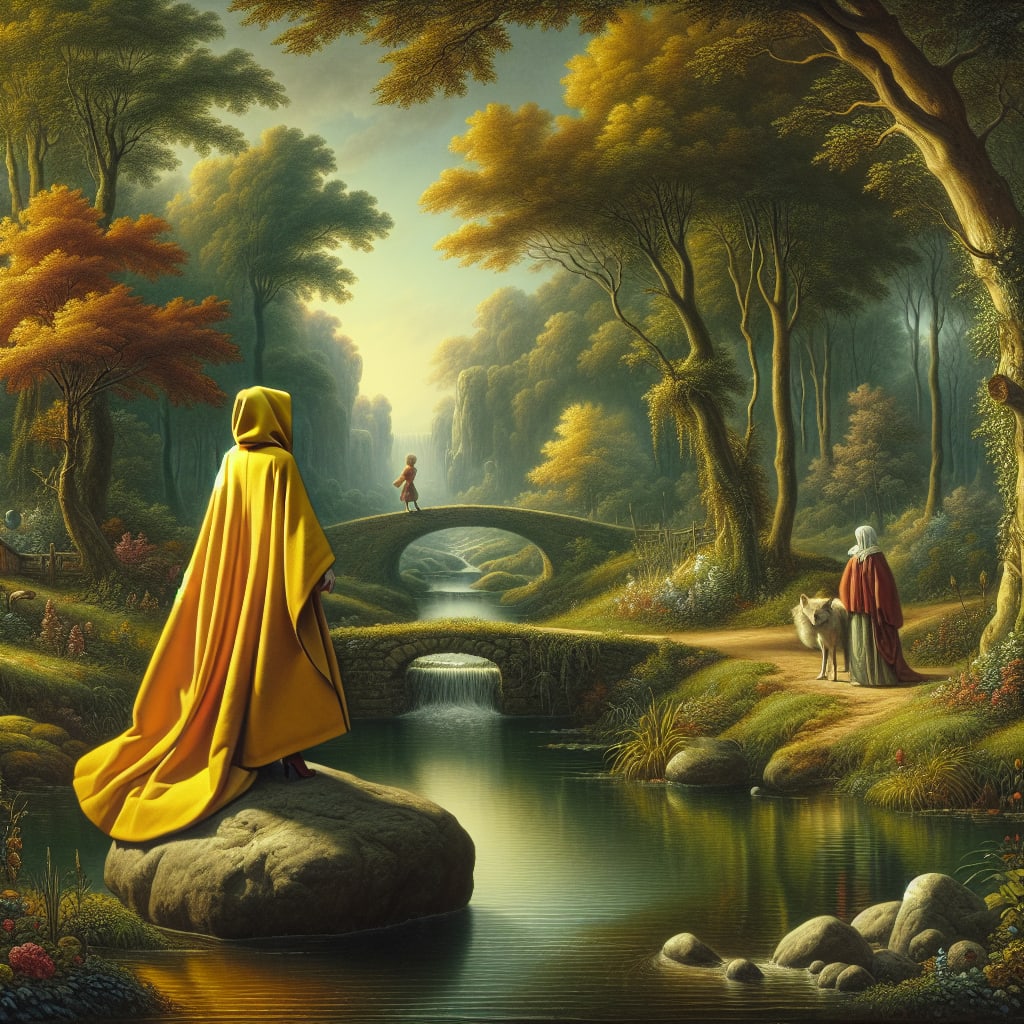 /showme painting of a woman in a yellow cloak standing on a rock in a forest, bridge between the worlds, very very well detailed image, the man stands out on the image, inspired by the Brothers Hildebrandt, in a baroque style, kanye, contemplating, gerit dou, guardian of the holy lake, distant hooded figures, very surreal garden, il, b