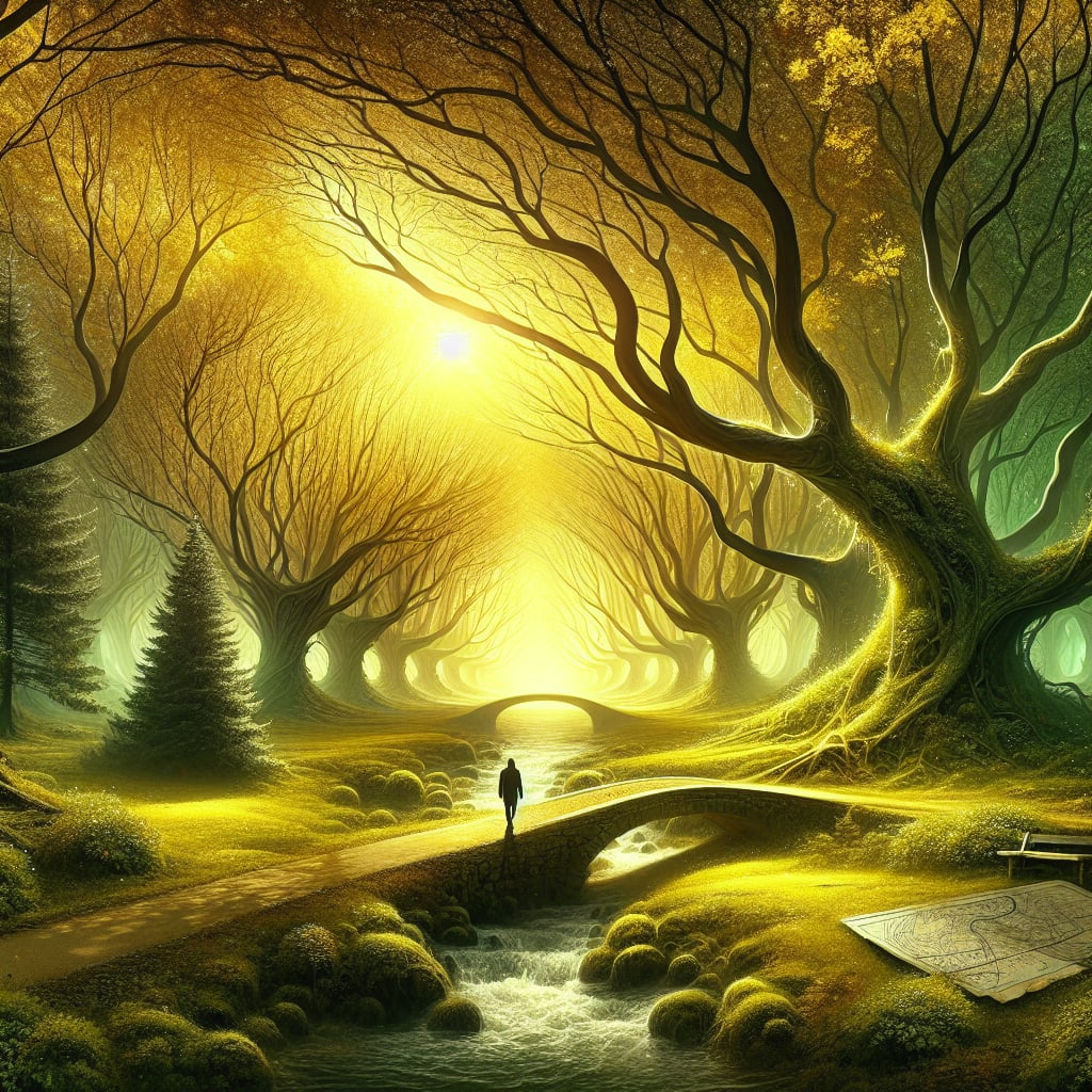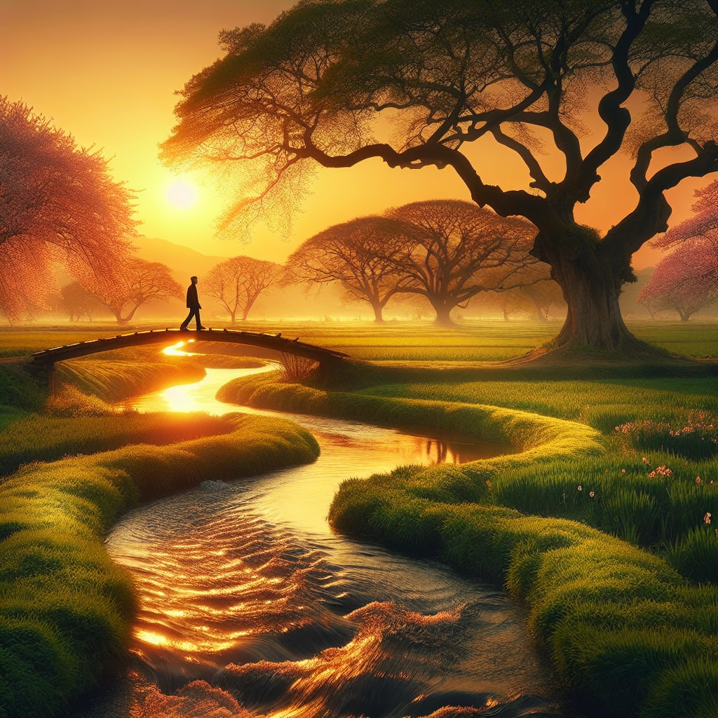 /showme In this stunning landscape, we see a person walking on a path that is surrounded by lush green grass and tall trees. The dominant colors in the image are yellow and brown, with accents of black throughout. The person appears to be crossing over a bridge that spans across a peaceful stream, adding to the tranquil atmosphere of the scene.
