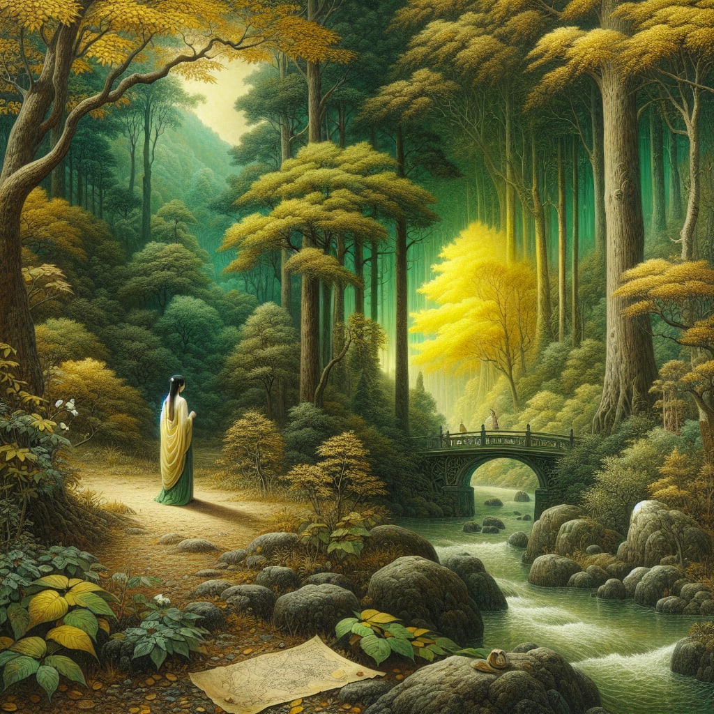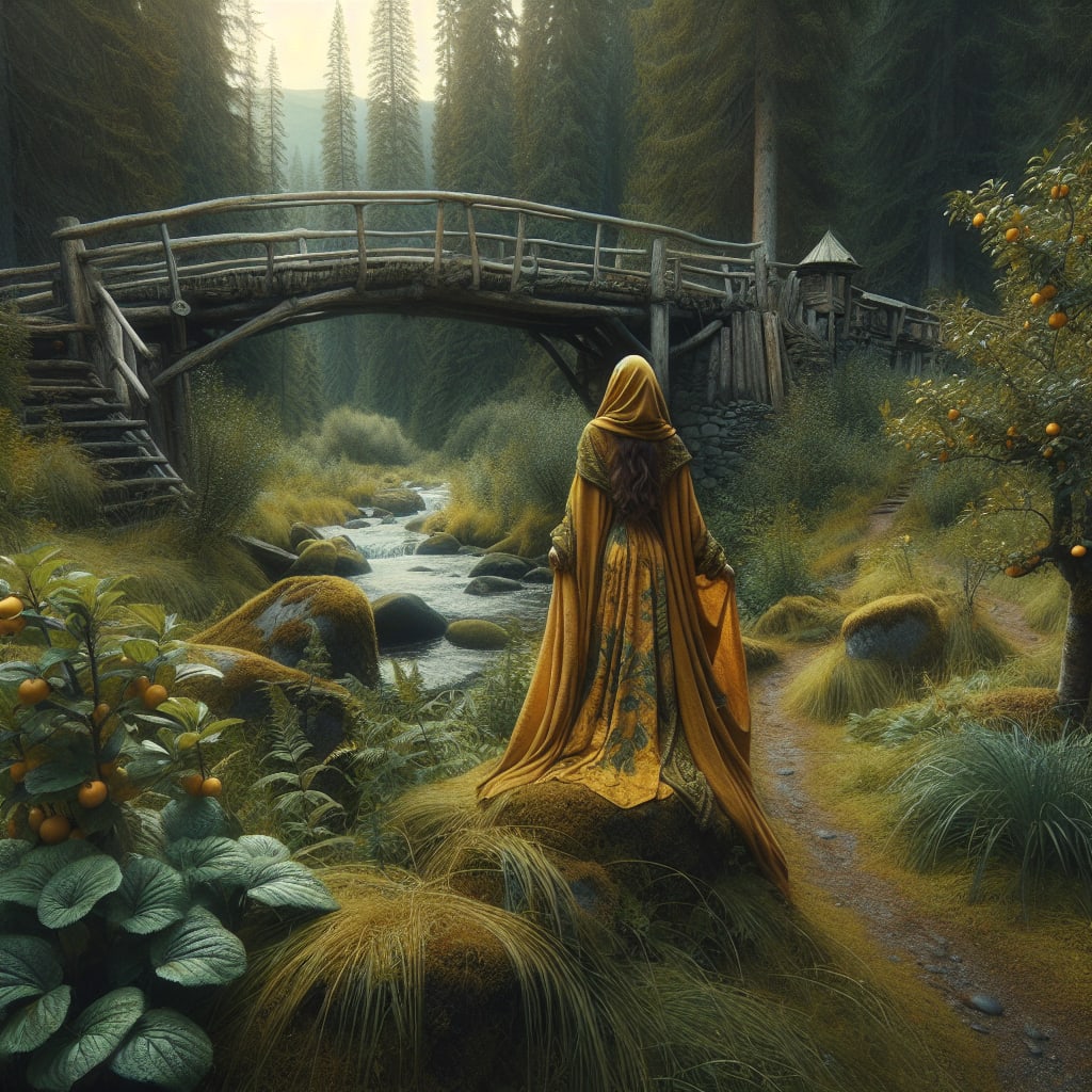 /showme This image is a painting of a woman standing on a path in a forest. The woman is wearing a yellow cloth, which appears to be draped over her body like a dress. She stands with one foot slightly forward and her arms at her sides, gazing off into the distance. Behind her, there is a bridge that spans across a river, surrounded by trees with vibrant green leaves. In the foreground of the painting, there are several plants and grasses scattered about, adding to the natural feel of the scene.