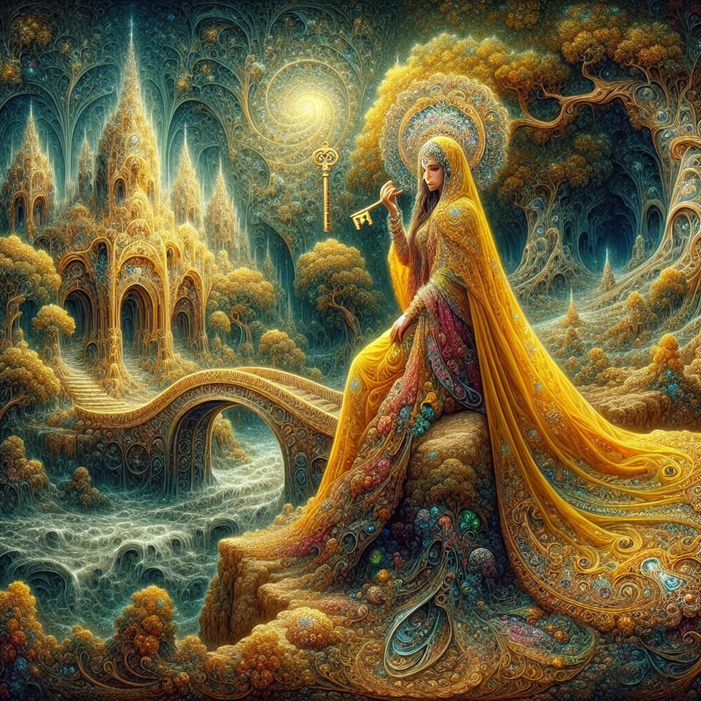/showme painting of a woman in a yellow cloak standing on a rock in a forest, highly detailed visionary art, hd wallpaper, fairyland bridge, celestial gardens, key is on the center of image, son, in the center of the image, greg beeple, very very well detailed image, fantasy drawing made of fractals, by Brothers Hildebrandt, looking away