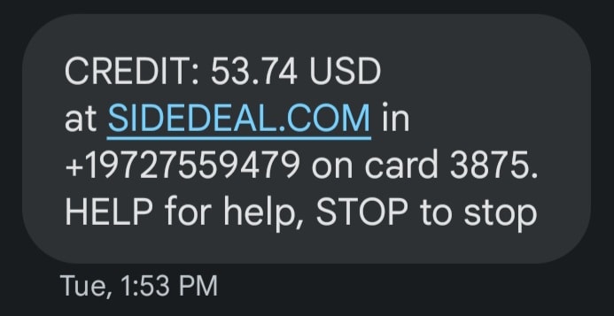 I get this alert texted to me whenever there is any transaction and I noticed very few merchants put their phone number in the description. Sidedeal is one of the few.
